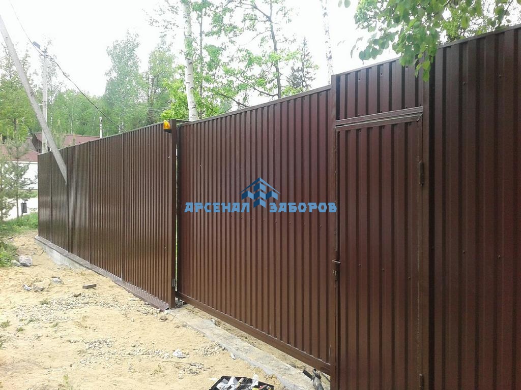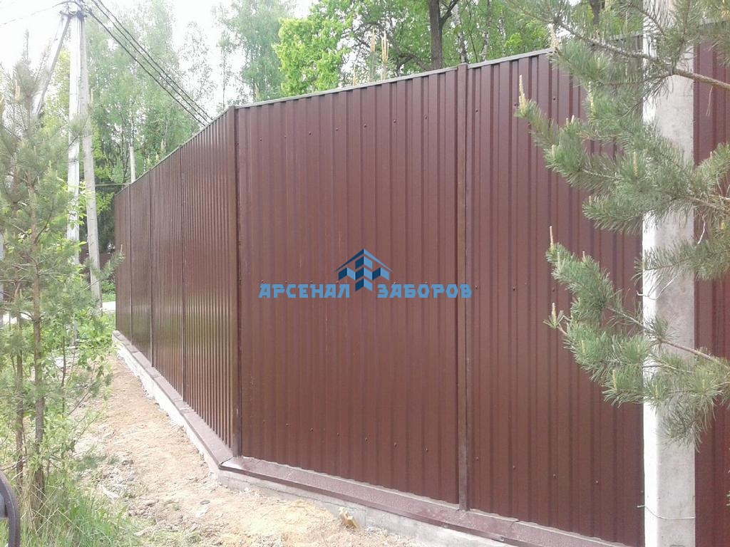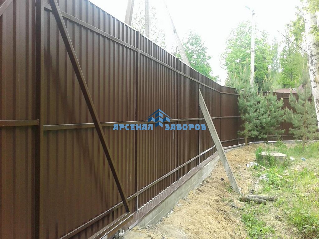 Конструкция забора из профлиста на ленточном фундаменте и с кирпичными столбами