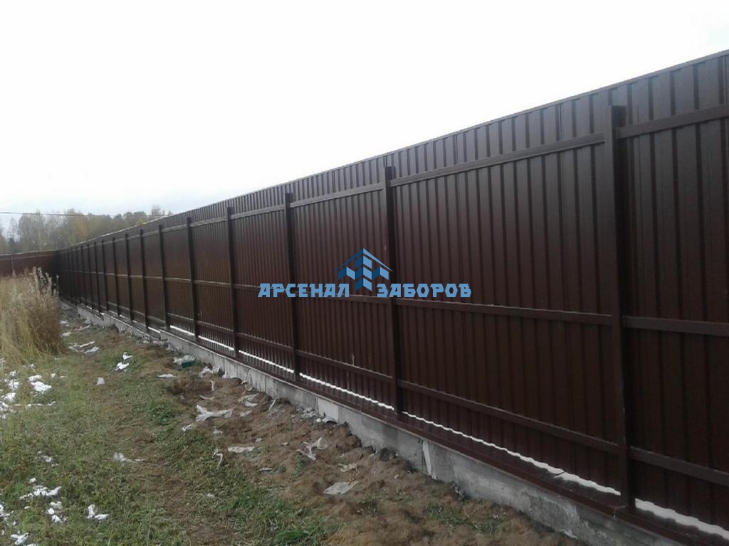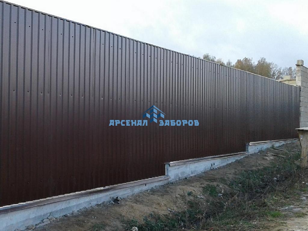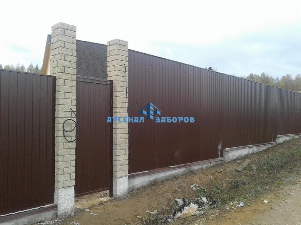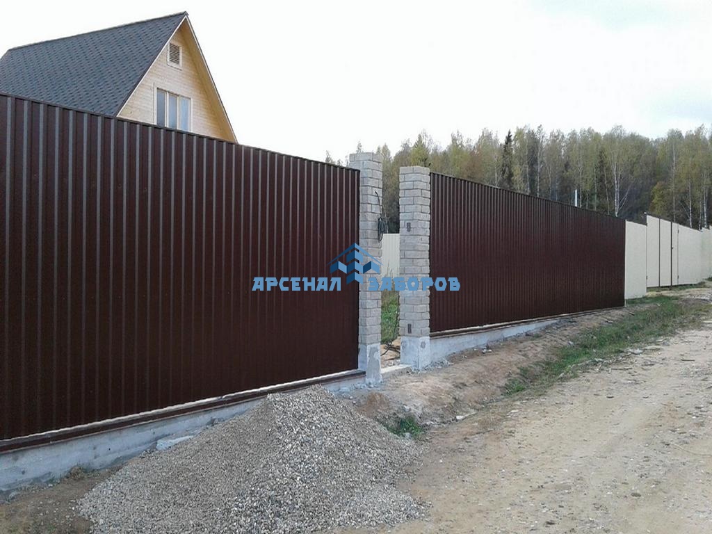 Конструкция забора из профлиста на ленточном фундаменте и с кирпичными столбами